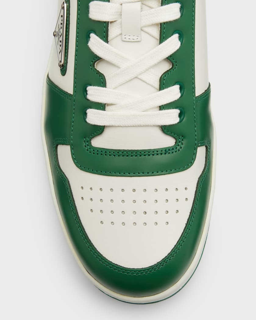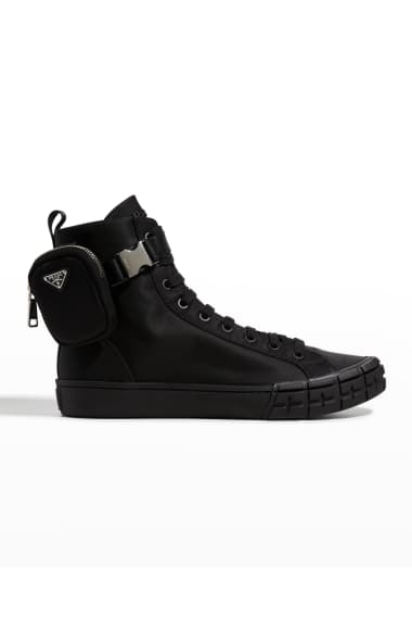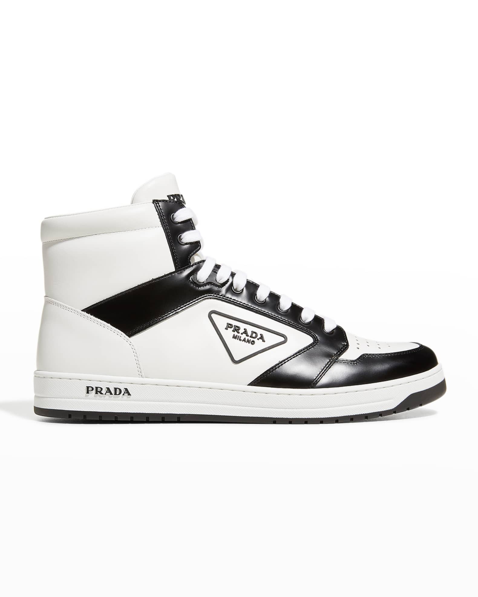 Prada Men S Avenue Logo Bicolor High Top Sneakers Neiman Marcus